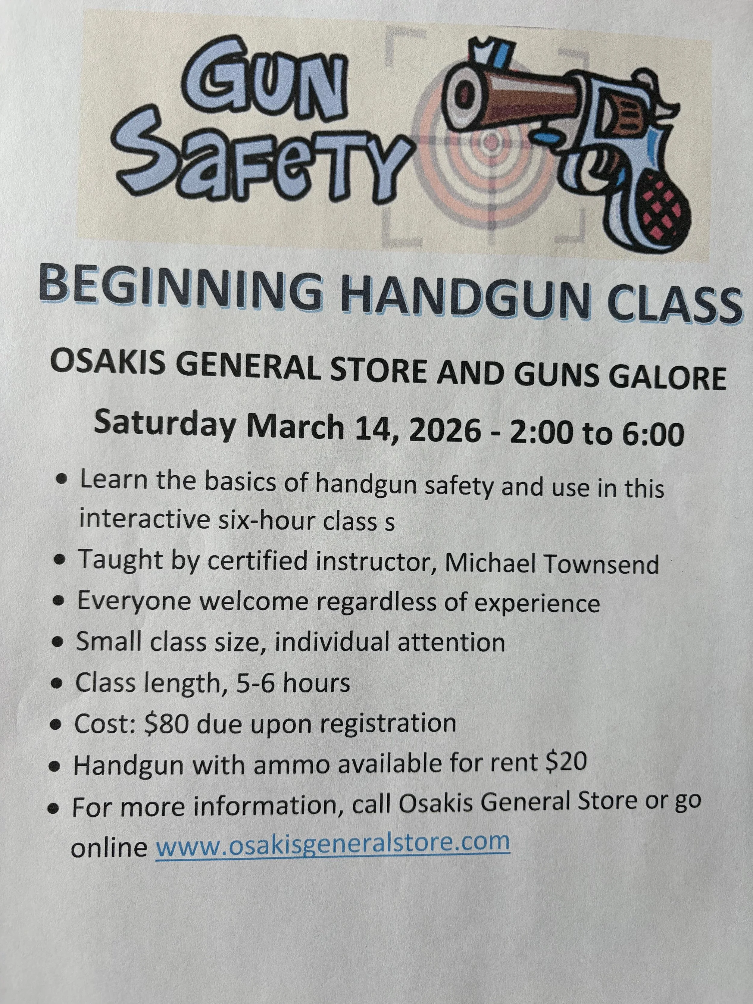 Certified firearms instructor, Mike Townsend, offers a beginning handgun/safety class at Osakis General Store and Guns Galore. In this 5-6 hour interactive class you will learn the basics of handgun safety and use.